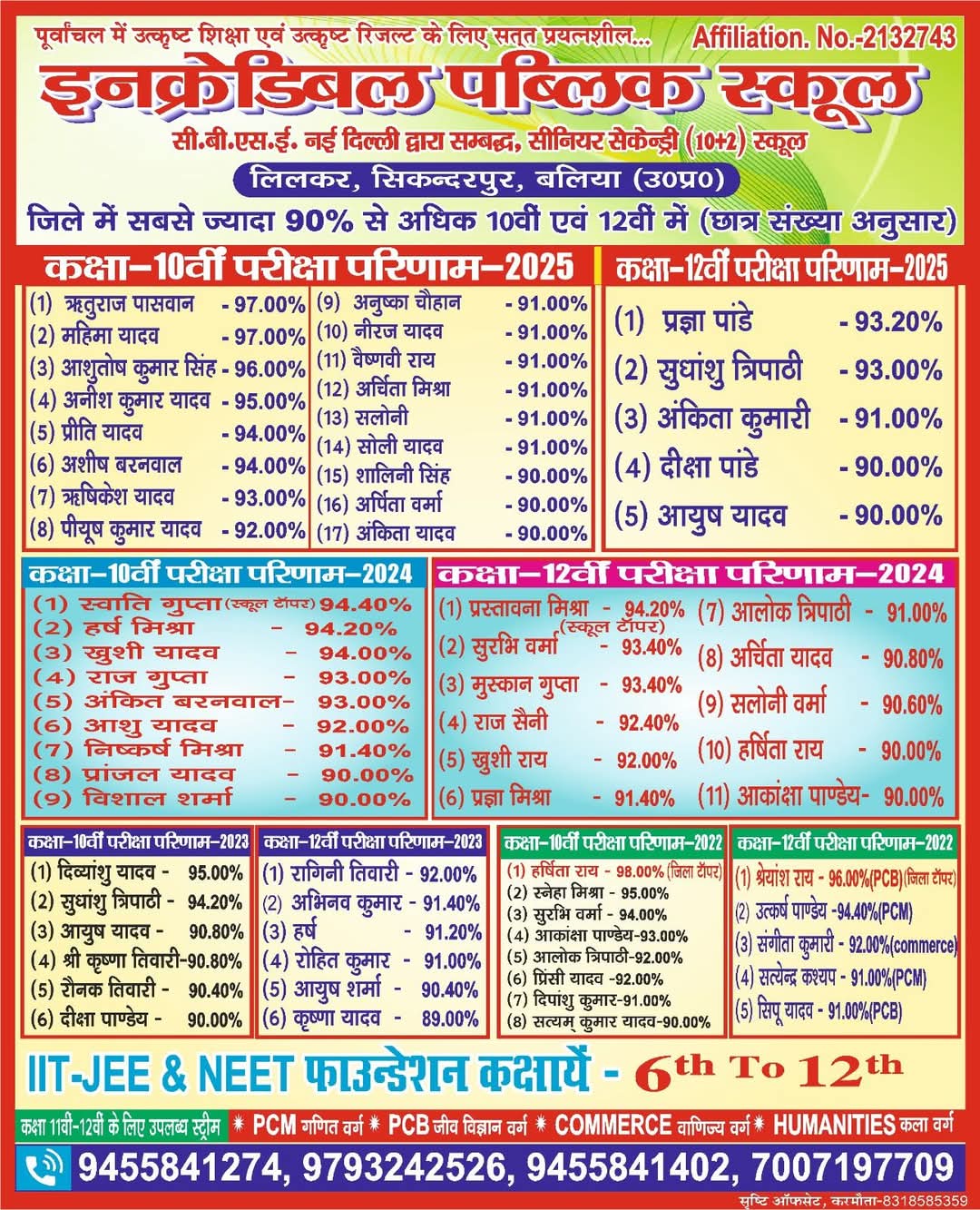 At Incredible Public School, Lilkar Sikanderpur, Ballia we are committed to academic excellence. Our curriculum is aligned with the National Education Policy (NEP) 2020 and focuses on conceptual learning, skill development, and real-world application. From foundational learning in early years to specialized IIT/NEET preparation from Grade 6 onwards, we ensure a well-rounded and future-ready education. For senior secondary students, we offer dedicated target classes for competitive exams such as JEE and NEET.